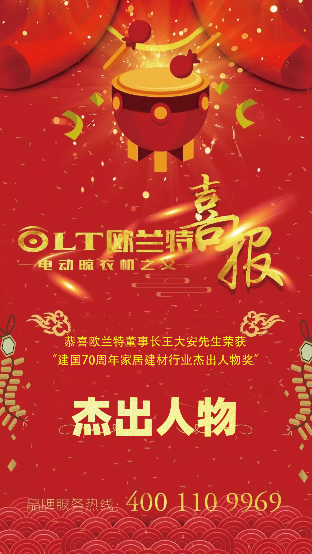 王大安,深圳市欧兰特智能控制系统有限公司创始人,现任欧兰特董事长。1995年他发明了第一台电动晾衣机,开启了人类智能晾衣新时代,被行业尊称为“电动晾衣机之父“,也是行业的守望者。先后多次成为董倩、姚雪松、水均益等央视著名主持人栏目的特约嘉宾,分享电动晾衣机的发明故事以及匠心产品创新历程,他不仅见证了晾衣机行业日新月异的变化及成长,在他带领下的欧兰特持续创新、不断突破,为海内外无数消费者提供了高质量的匠心产品。本次荣获【建国70周年家居建材行业杰出人物奖】实属实至名归。