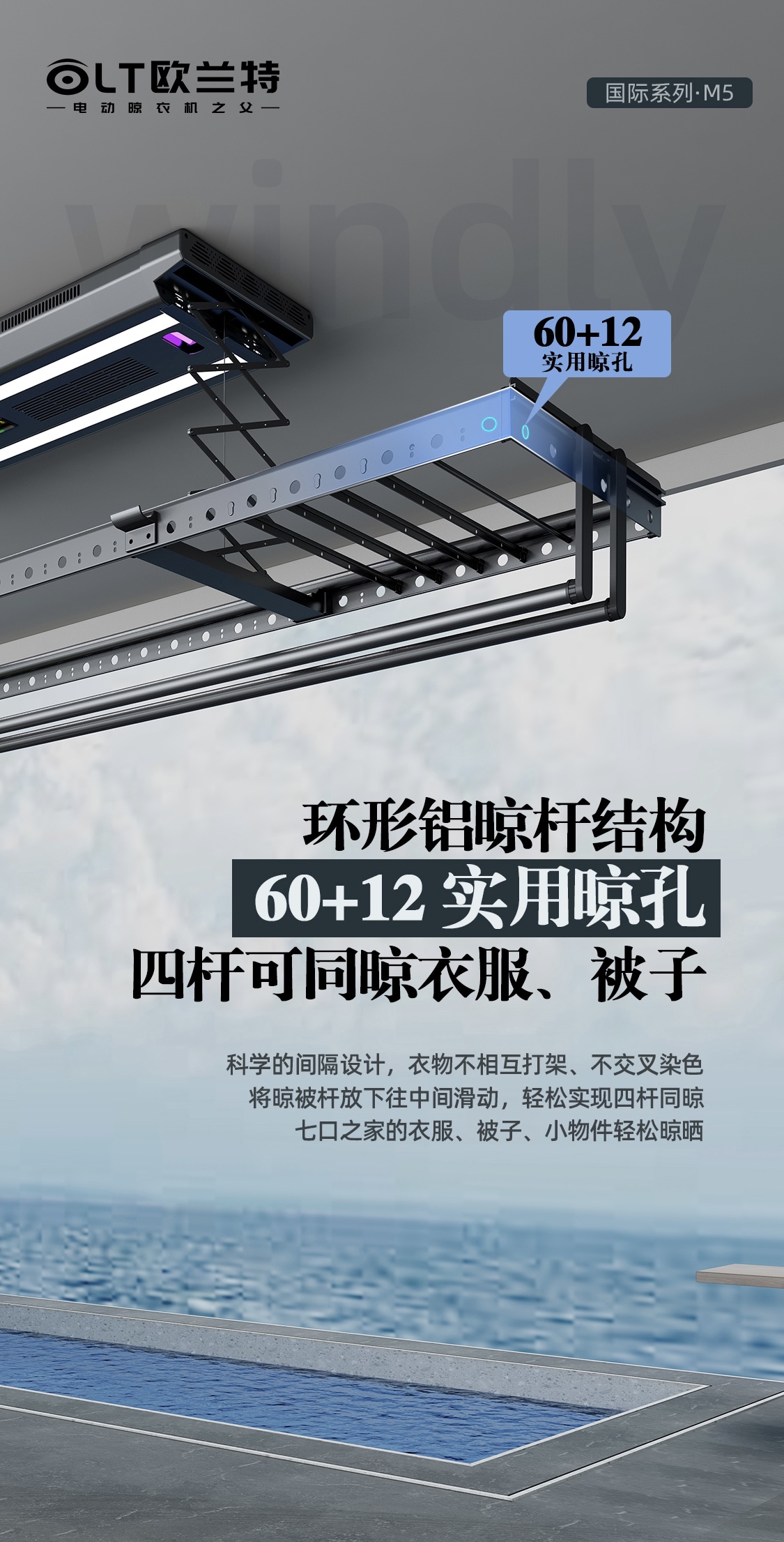 晾晒孔位的数量直接关系到晾晒效率和方便性。环形晾晒设计,不仅美观大方,还能提供充足的晾晒孔位。拥有72个晾晒孔位的电动晾衣机,比同行多一倍的孔位数量,让您的晾晒更加随心所欲,实现真正的晾晒自由。
