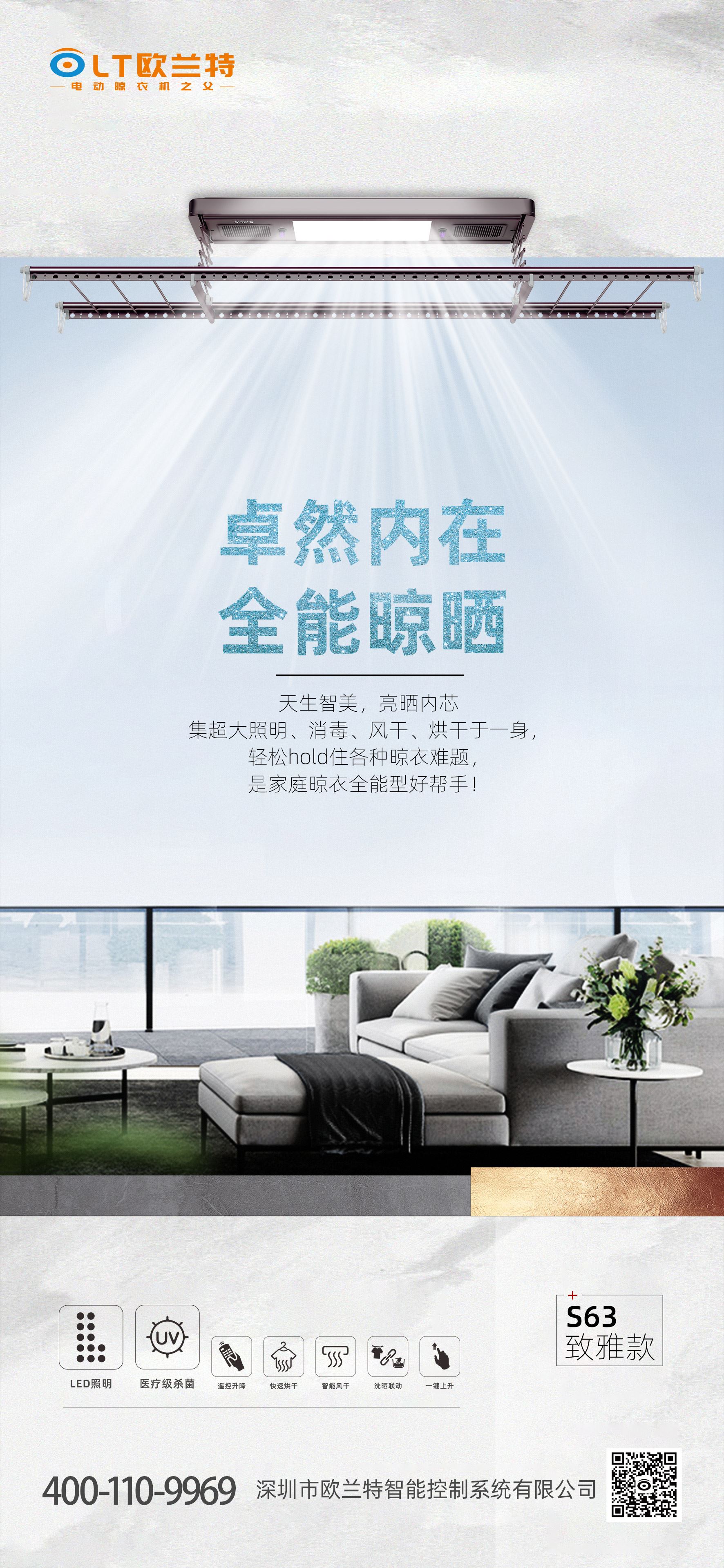 为了聚焦用户智能晾晒的需求,欧兰特推出2021年火爆千元机——“致雅款”【S63】,集超大照明,360°无辐射消毒,自然风干,快速烘干、智能语音控制等于一身,是欧兰特研发实力、智能技术呈现的创新佳作,也是市场期待已久的新品;让千家万户进入“无智能,不生活”的居家新体验,满足用户健康穿衣的晾晒需要和节省多余的时间陪伴家人!