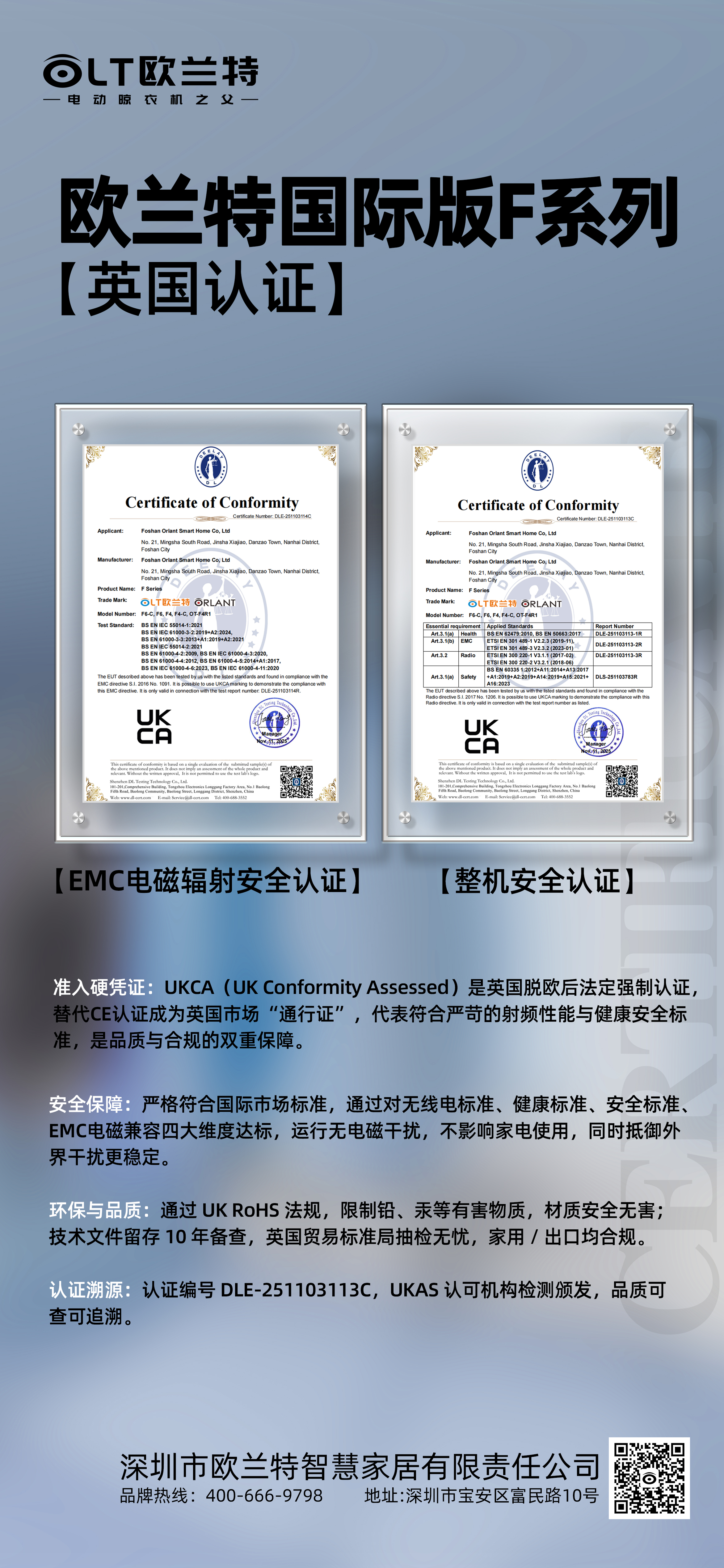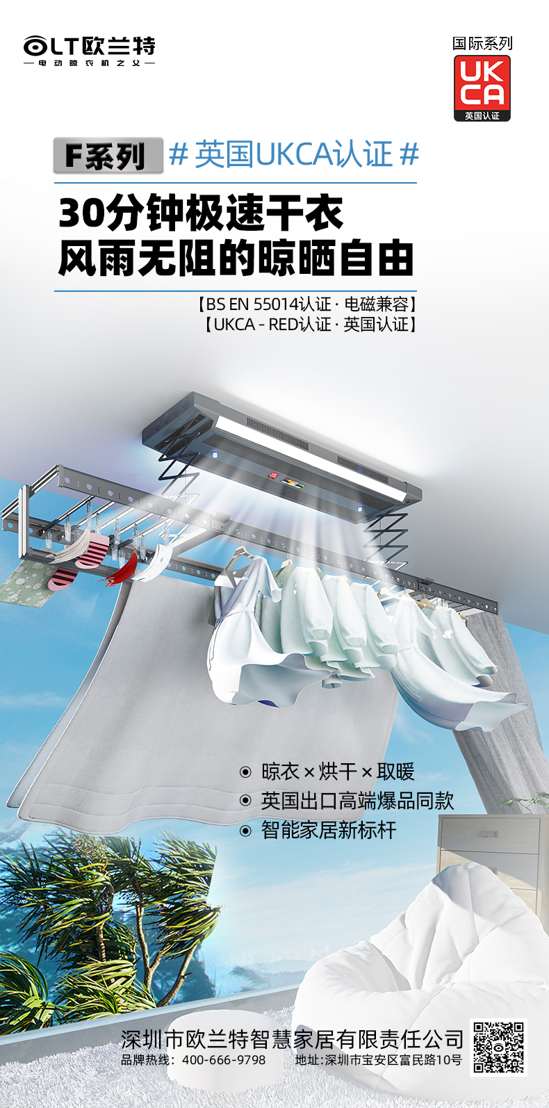 在全球化浪潮与区域市场规则交织的今天,欧兰特用UKCA认证的硬核实力证明:真正的国际品牌,既要懂世界的标准,更要守品质的初心。这款风行英伦的电动晾衣机,不仅是"中国制造"走向世界的缩影,更是"电动晾衣机之父"持续定义行业标准的有力见证。